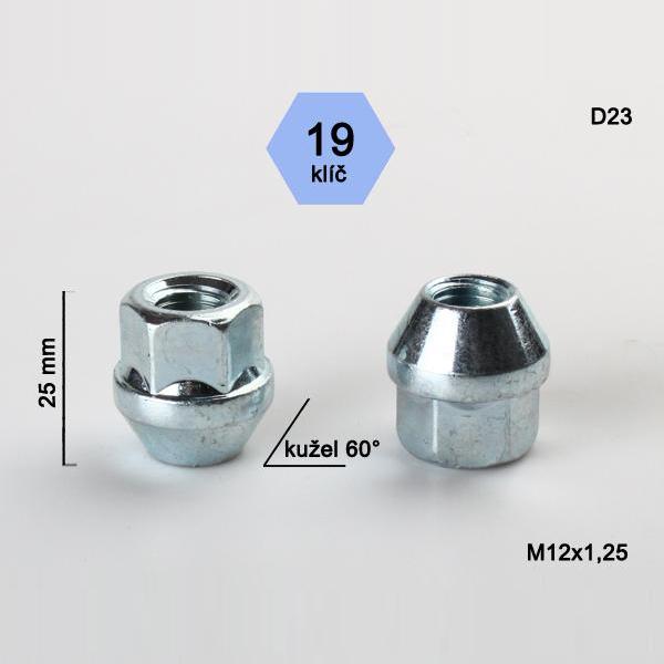 Kolová matice M12x1,25, dosedací plocha kužel 60°, délka závitu 25 mm, pevnostní matice určená k uchycení ALU disků k automobilu.